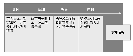那么作为项目经理,应该履行那些一般管理职能呢?当然还是“计划-组织-领导-控制”这四大职责(下图是罗宾斯管理四大职责图表),对应这个图表,让我们分析作为项目经理的四大职责至少应该包括那些内容: